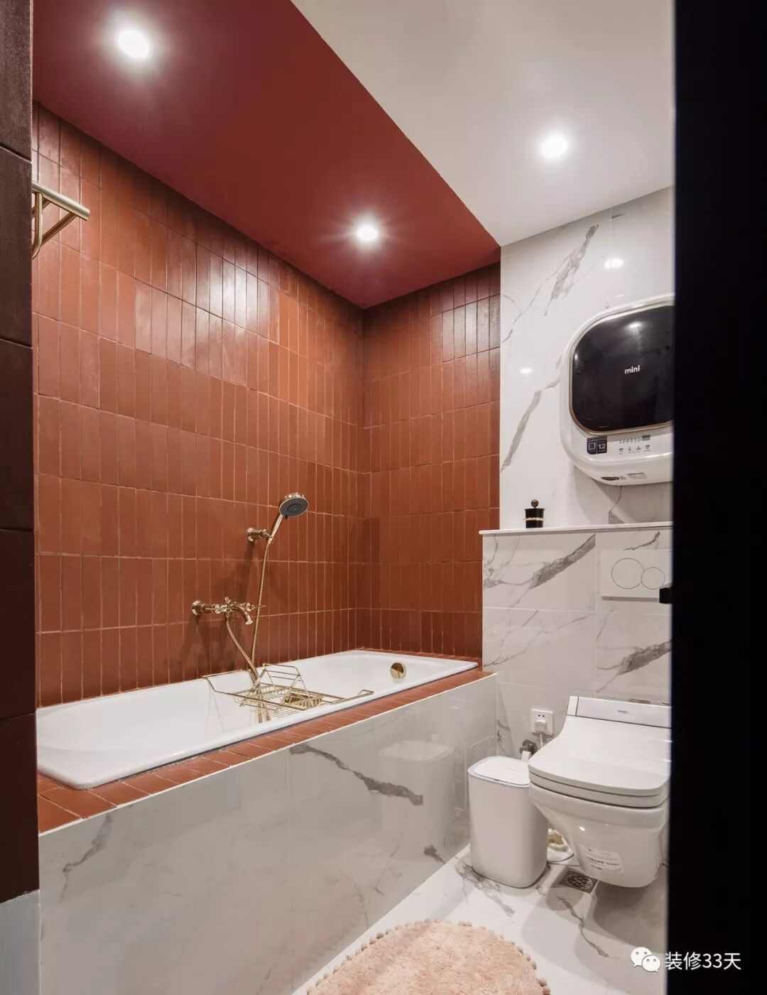 ▲ 主卫白色搭配吸睛的一抹暖橘,设置壁挂马桶,上面装壁挂洗衣机