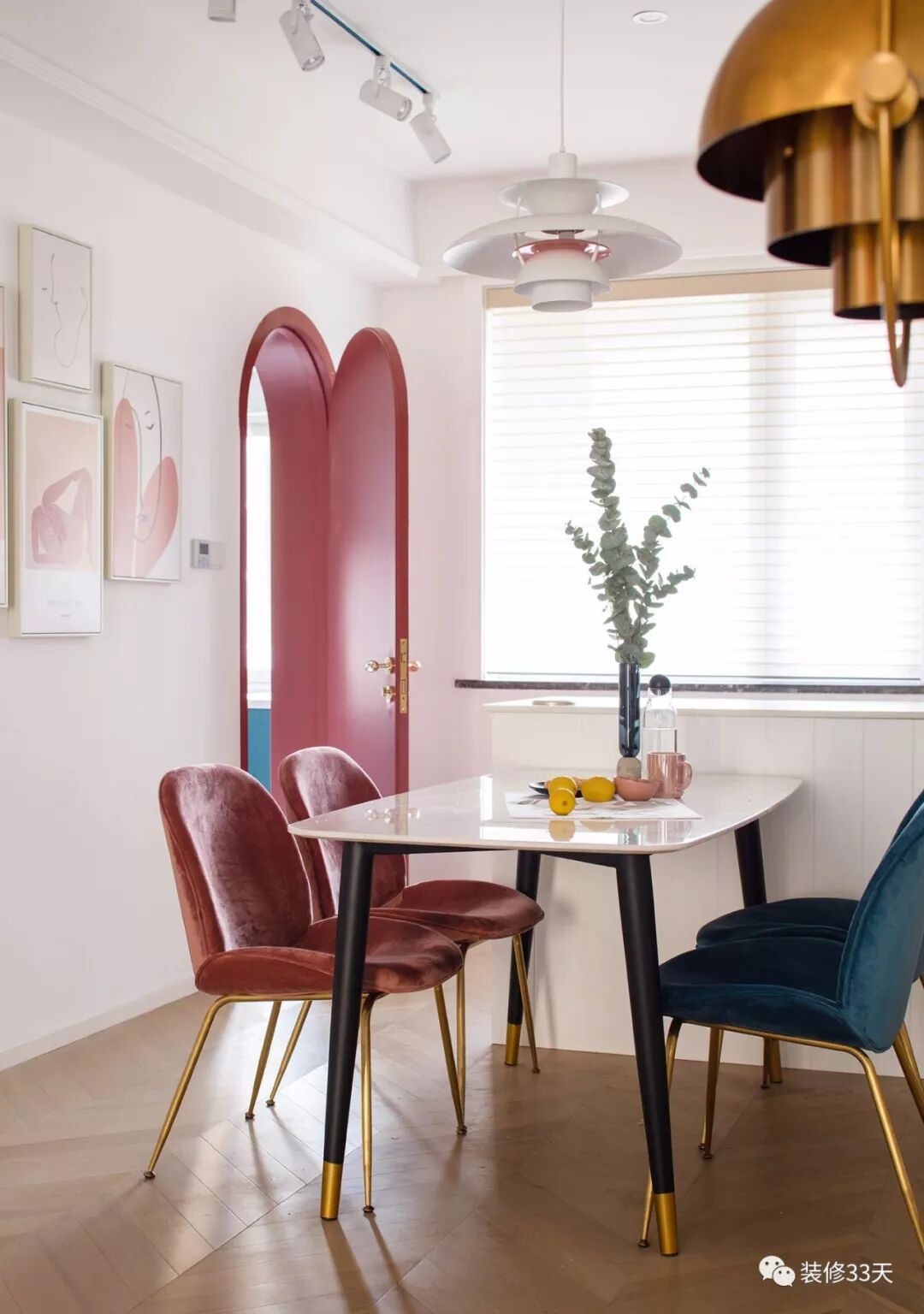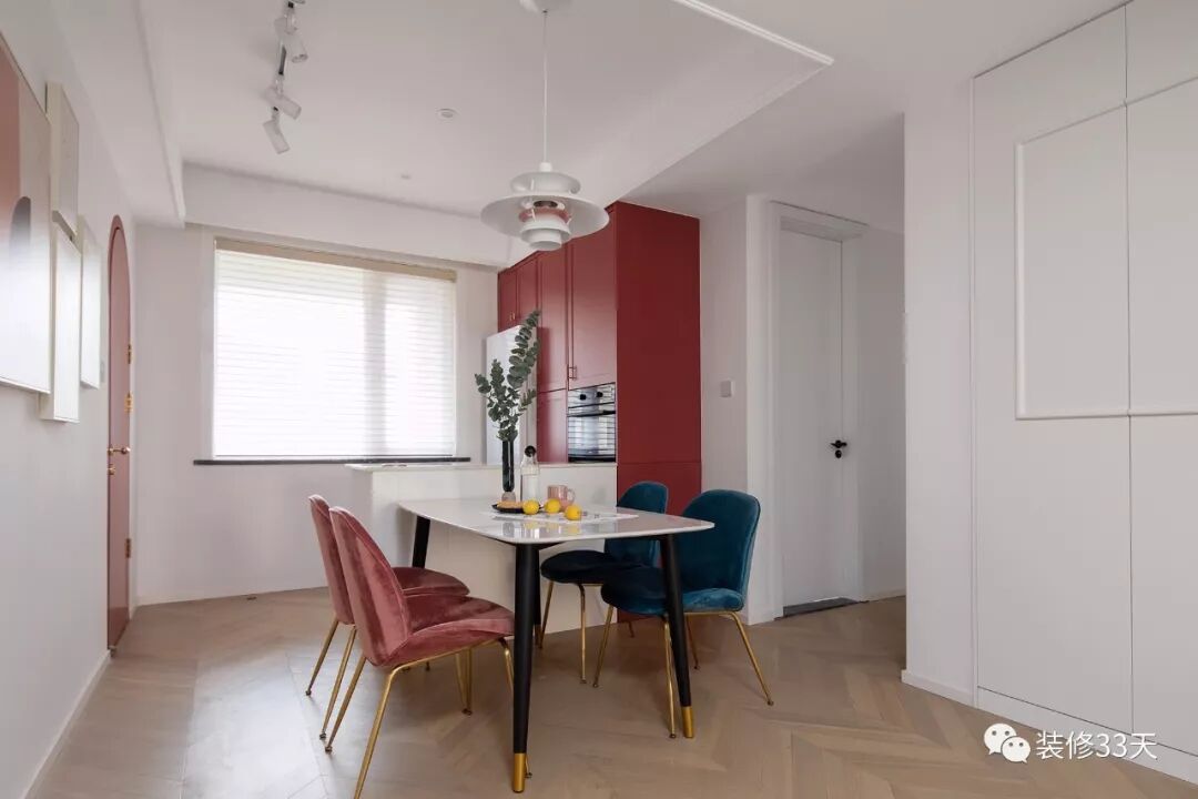 ▲ 餐厅背景延续白墙,装点艺术挂画,红色和蓝色结合的舒适座椅,简约时尚