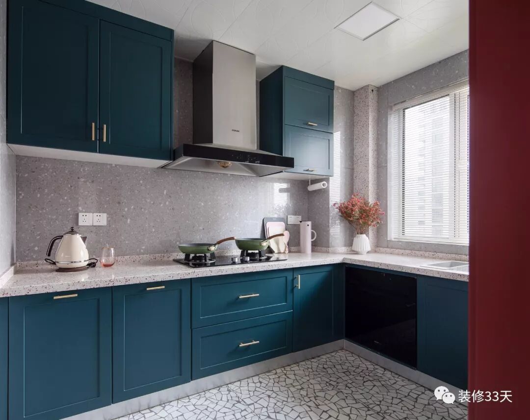 ▲ L型布局的厨房,采用灰色水磨石瓷砖搭配蓝色柜门,金色的拉手让整体看起来更加清新优雅