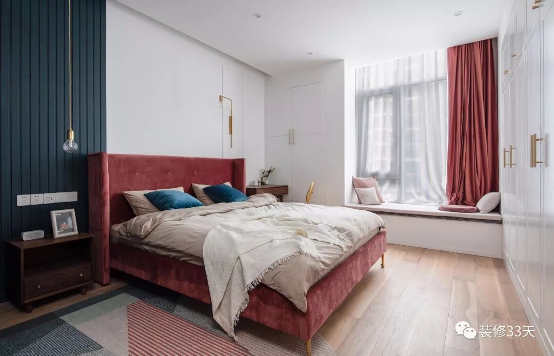 ▲ 主卧的整体设计延续温柔轻奢风,以蓝红白为空间基调,床背景局部采用墨蓝色系,打造就寝空间的浪漫氛围