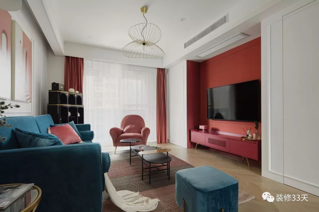 ▲ 电视墙一侧打造收纳柜,另一侧借位做次卧的隐形开门,内凹涂刷红色背景搭配桃粉色电视柜,层次与个性鲜明
