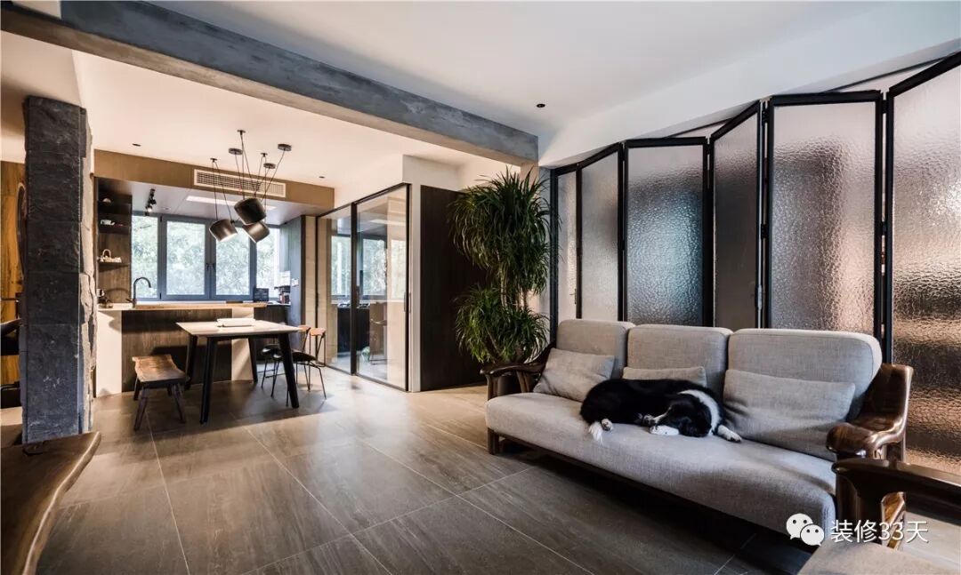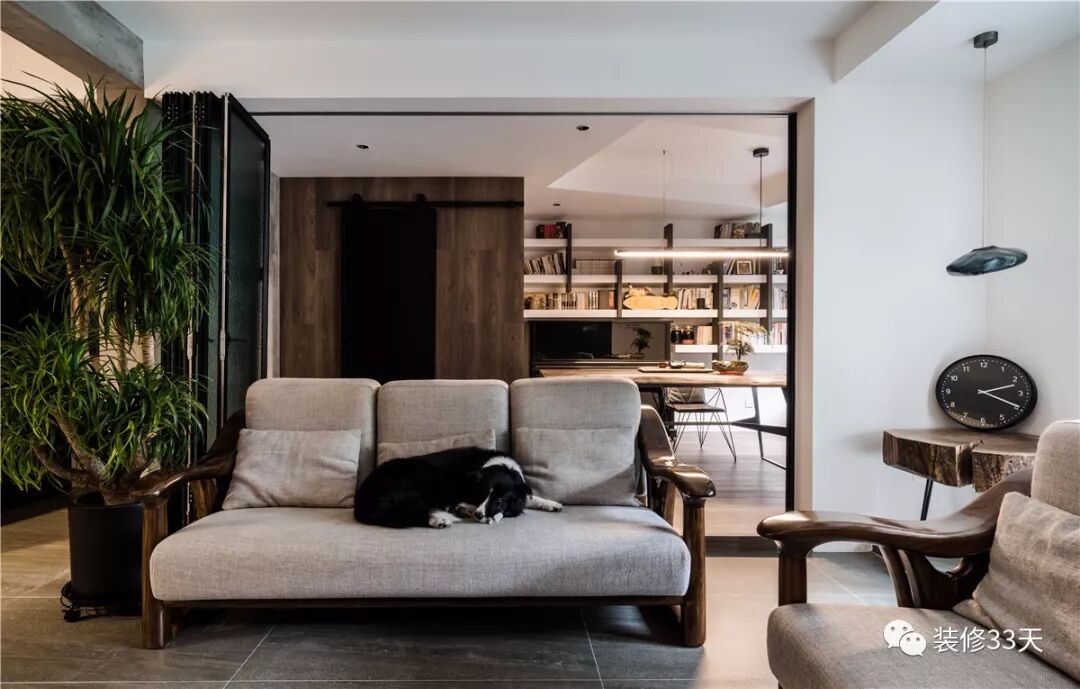 ▲ 实木结合布艺的耐用家具,搭配繁茂的绿植,后方采用折叠玻璃移门作书房的隔断