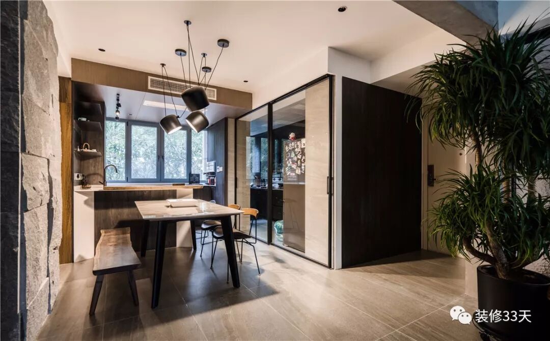 ▲ 餐桌与岛台结合,石面餐桌搭配木色岛台,工业风的椅凳呼应吊灯