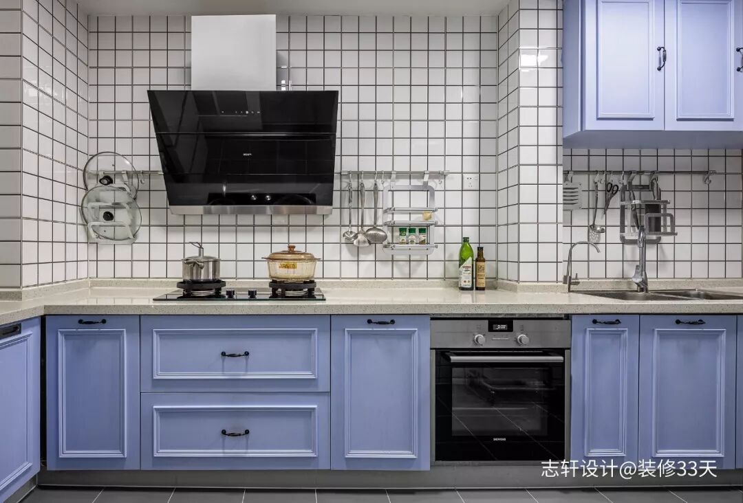 ▲ 厨房,深灰色地砖搭配小白砖墙面,马卡龙紫的柜门,宁静淡雅