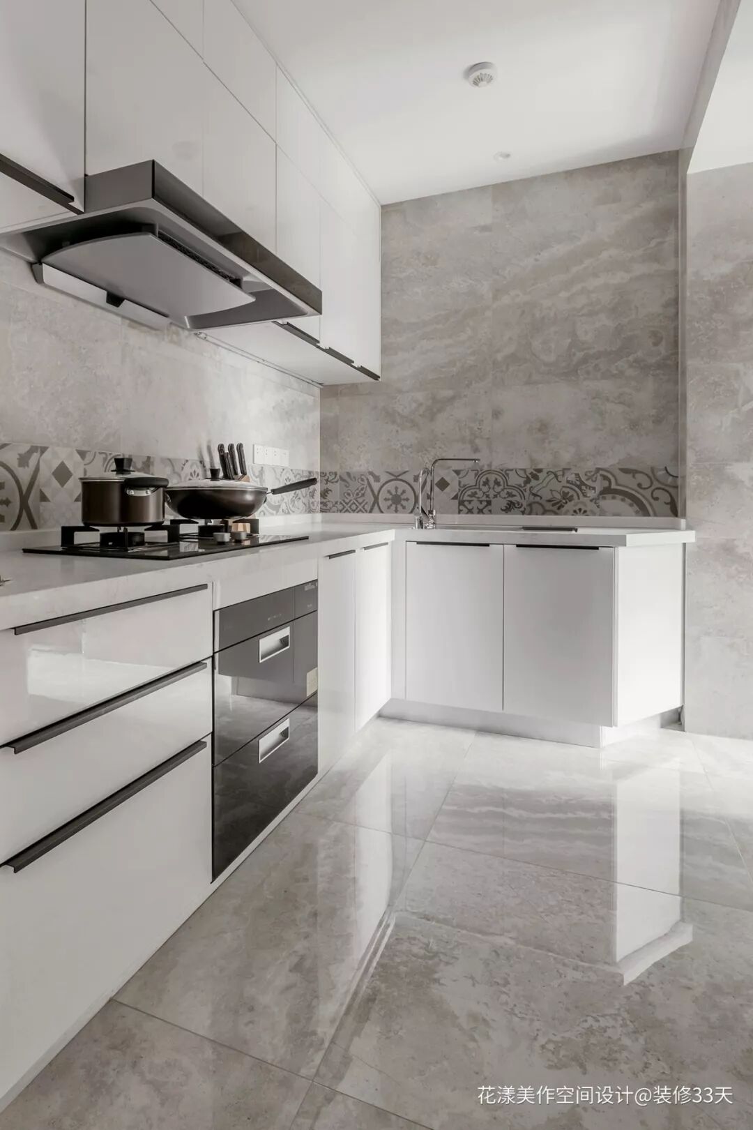 ▲ 厨房墙地通铺浅咖色石纹瓷砖,采用同色系花砖作腰线修饰