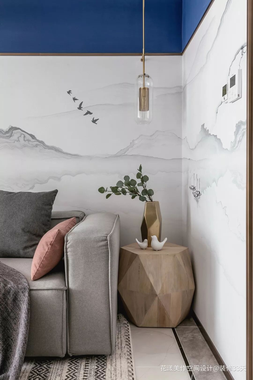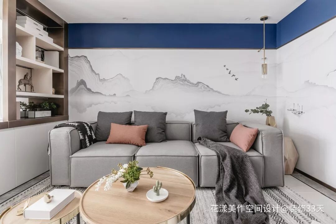 ▲ 沙发背景墙,定制大幅中国风山水墙布,上方采用不锈钢勾勒出蓝色饰带