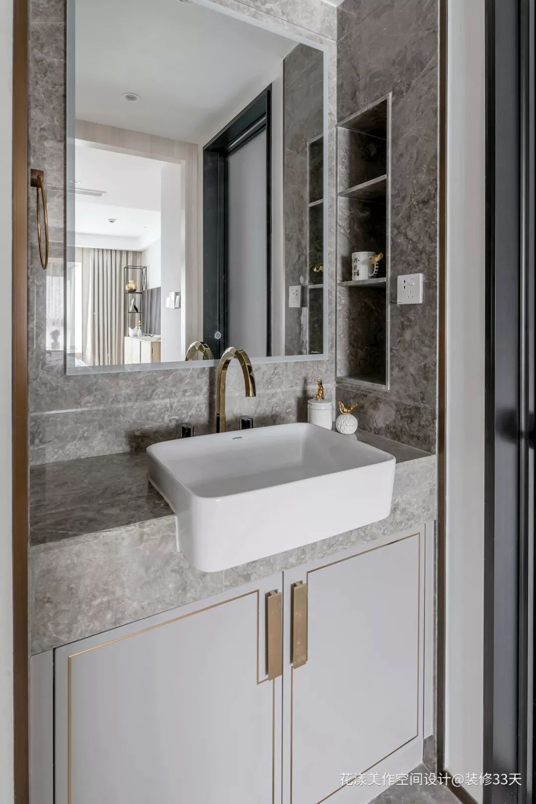 ▲ 卫生间干湿分离,墙面内嵌壁龛,灰色台盆柜采用金色中式装饰框,搭配精致铜制把手,丰富细节感