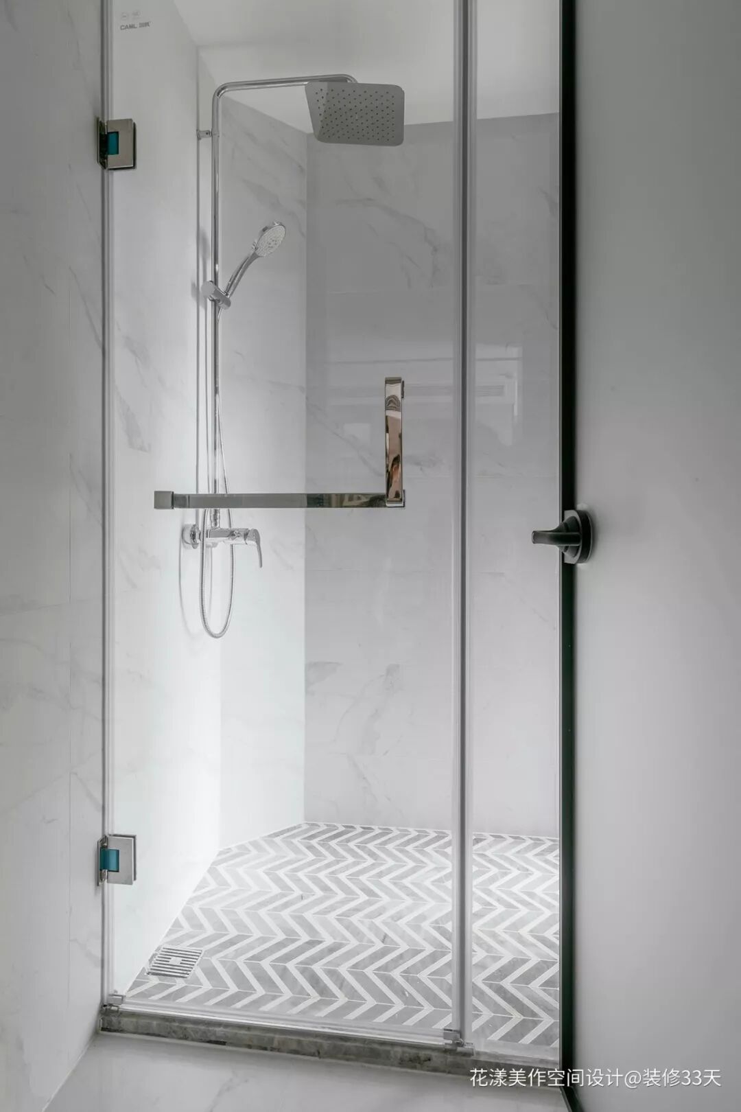 ▲ 通过空间整合,增加出卫生间淋浴区,低饱和的用色搭配清玻拉门,地面鱼骨纹路,简洁大气