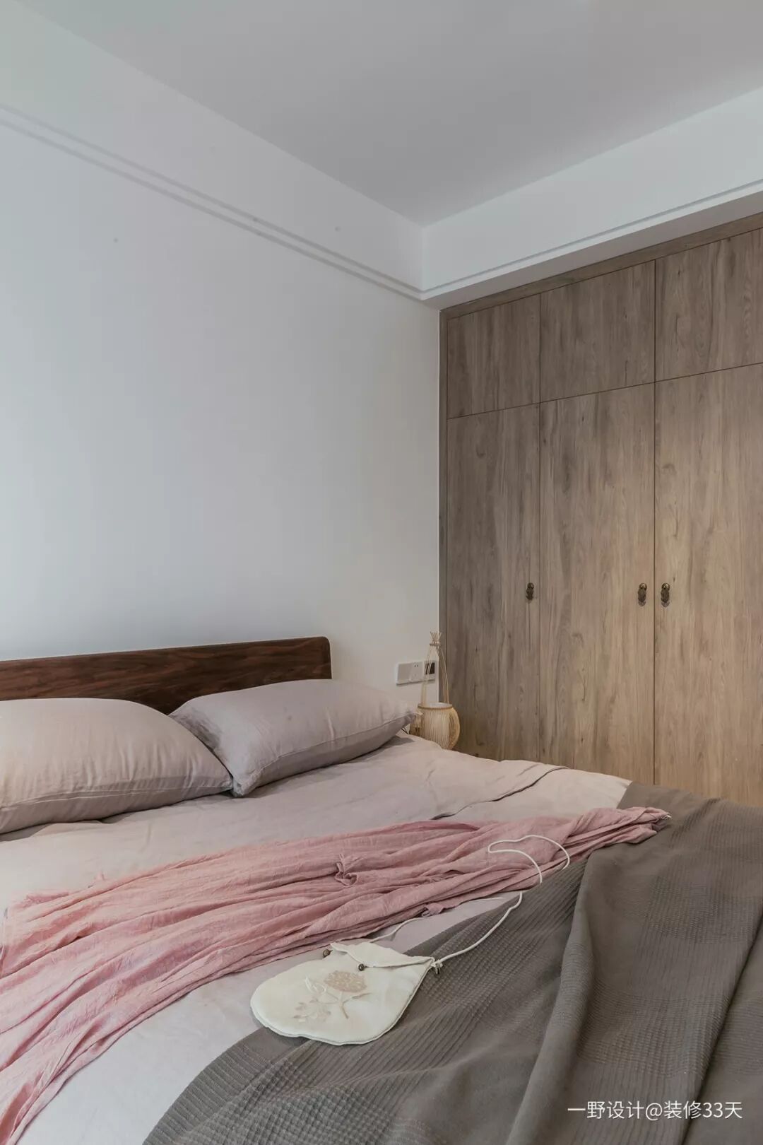 ▲ 主卧纳入阳台,扩大使用面积,整体延续次卧的基调,原木大床配以藕粉色床品,用低彩度的浅色提亮空间