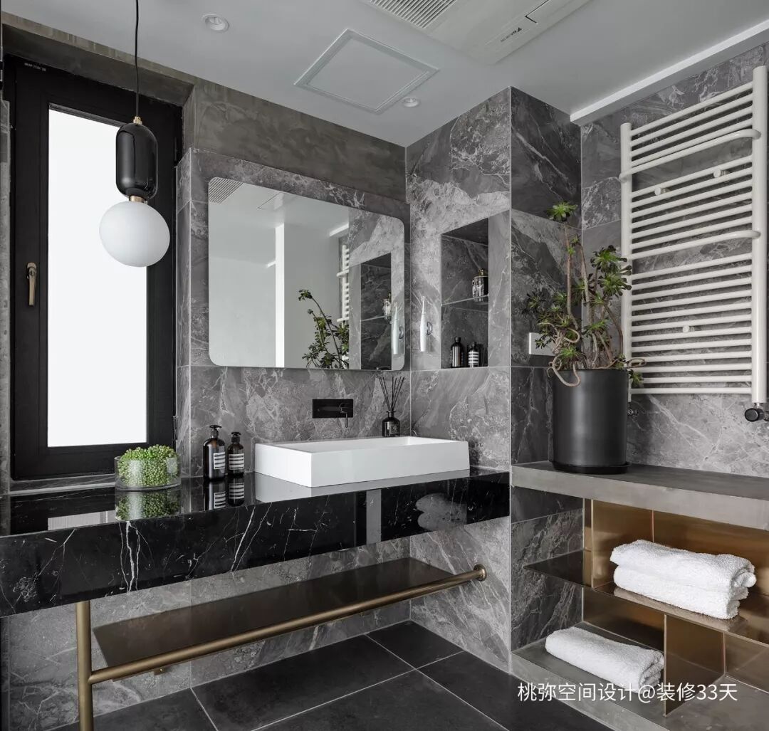 ▲ 卫生间,三分离设计,灰色大理石墙砖配大理石台面,台上盆、墙排龙头、黄铜元素,彰显居家品质