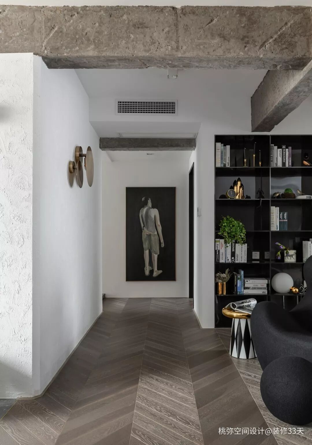 ▲ 公领域望向私领域空间,地面延续鱼骨拼地板,走廊端景的装饰画来自于独立艺术家绘画作品