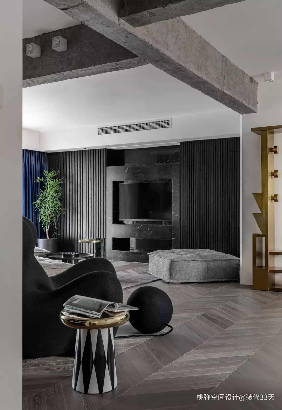 ▲ 客厅,黑白灰三色空间,采用鱼骨拼木纹地板加铺大张地毯,选择低矮柔软的沙发,可以让女儿在地上随意玩耍