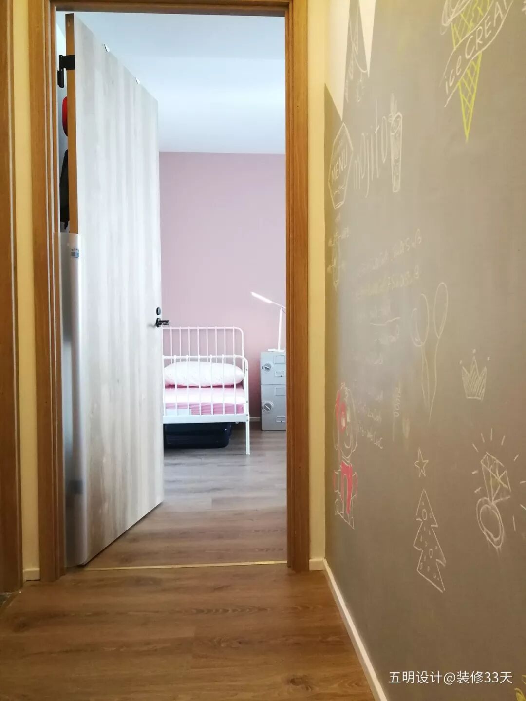 ▲ 过道,顶面采用木质元素装饰,与房屋整体调性相统一,内嵌灯光简单却更具设计感,一侧墙面涂上黑板漆,满足童年的天马行空