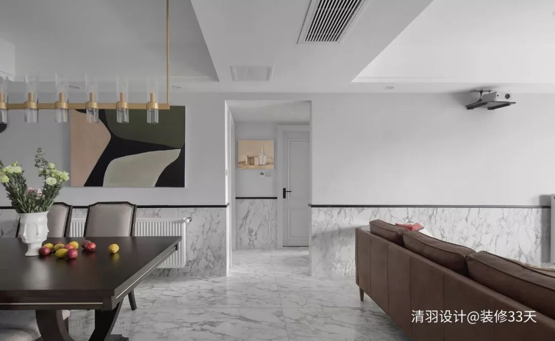 ▲ 因为家有萌宠,整个公领域地面铺贴的石纹砖延伸至半墙,更利于日常打理
