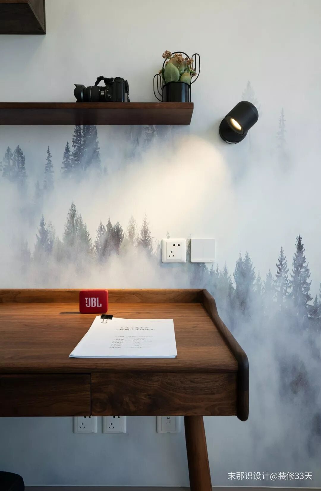 ▲ 书房空间不大,木地板搭配白墙,铺贴一面雾气深林的壁纸背景