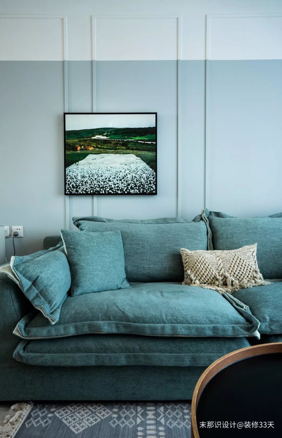 ▲ 蓝白分色背景墙,采用细致的石膏线勾勒造型,点缀哈拉尔德的《 Flower Meadow in the North 》挂画