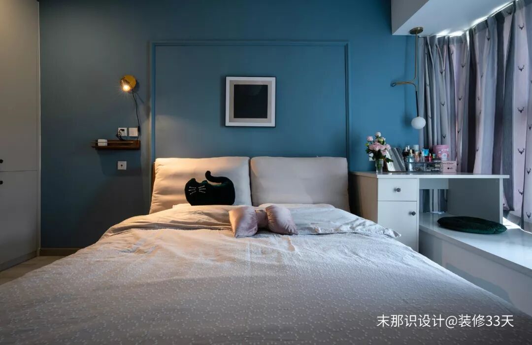 ▲ 主卧,采用低纯度低明度的蓝色乳胶漆打造床背景,点缀金属床头灯柔和的暖光,利用飘窗定制梳妆台