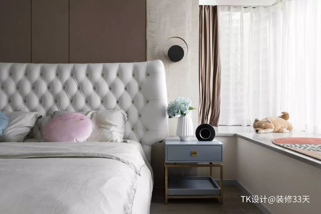 ▲ 主卧,木色地板+简洁无主灯顶面,暖色调的墙面搭配米白色皮质大床,转角飘窗成为卧室休闲一角