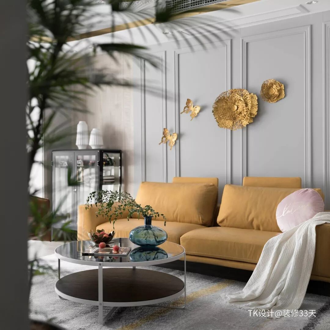 ▲ 以姜黄色沙发为中心,地毯、墙饰以及顶面饰带,暖调金黄色在整个客厅中相互呼应