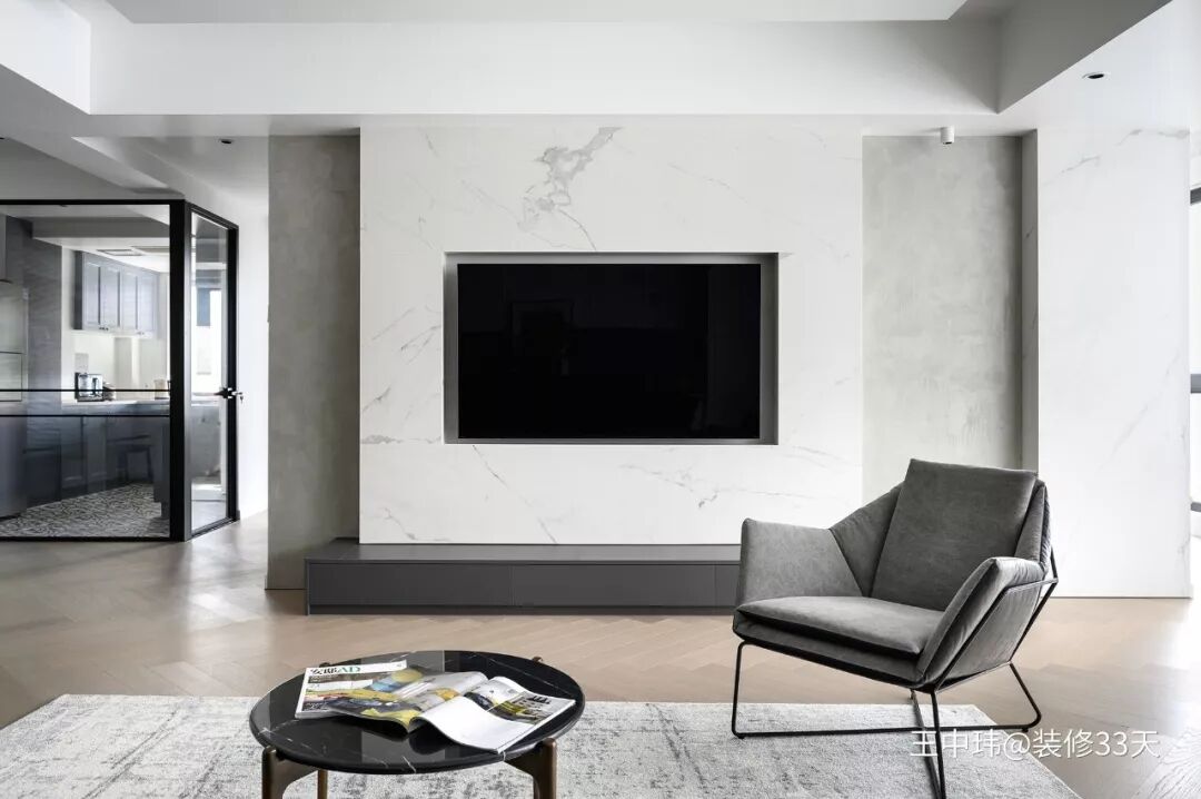 ▲ 采用白色大理石和水泥墙打造层次感电视墙,底部定制长条形电视柜,简约实用
