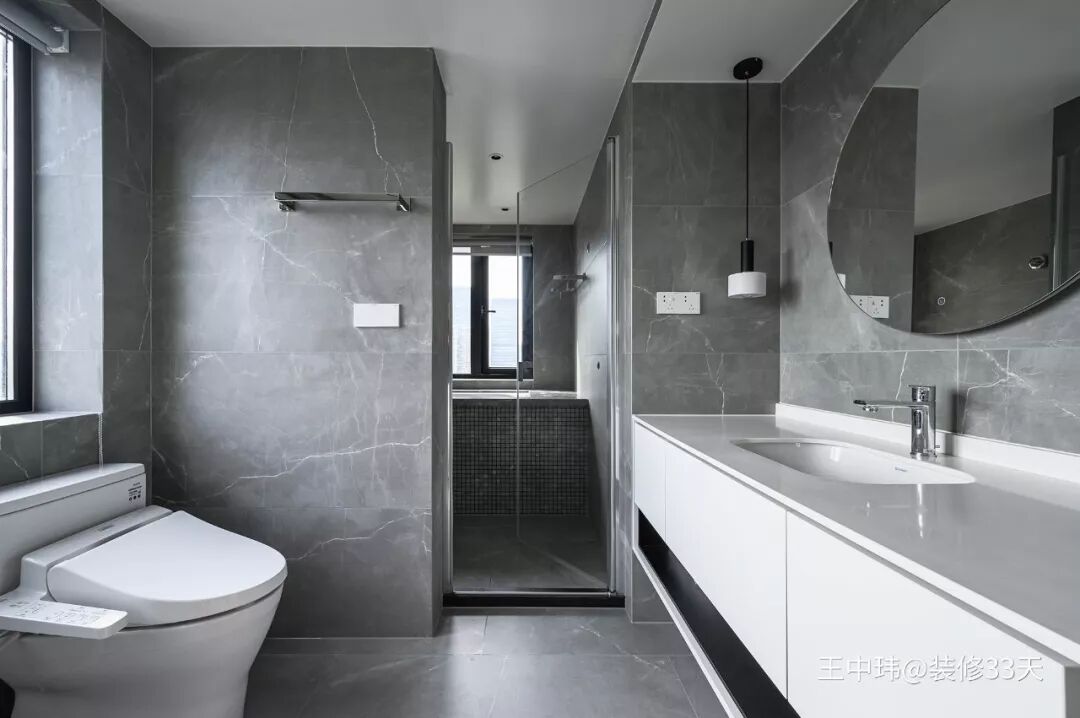 ▲ 客卫干湿分区,灰色石纹砖墙地一体,凸显高级感
