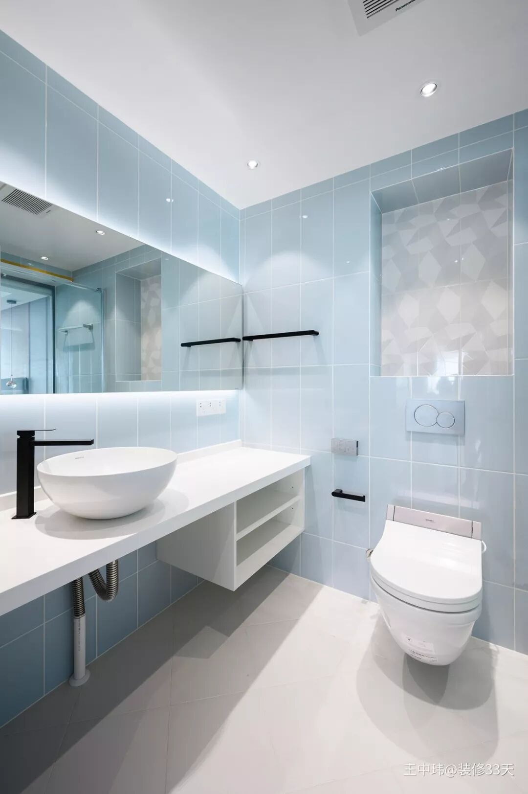 ▲ 主卫,以蓝白色为基调,干净清爽,壁挂式马桶上方增设壁龛