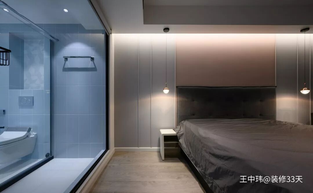 ▲ 主卧,大面积定制柜,打通主卫隔墙,并用透明玻璃替代