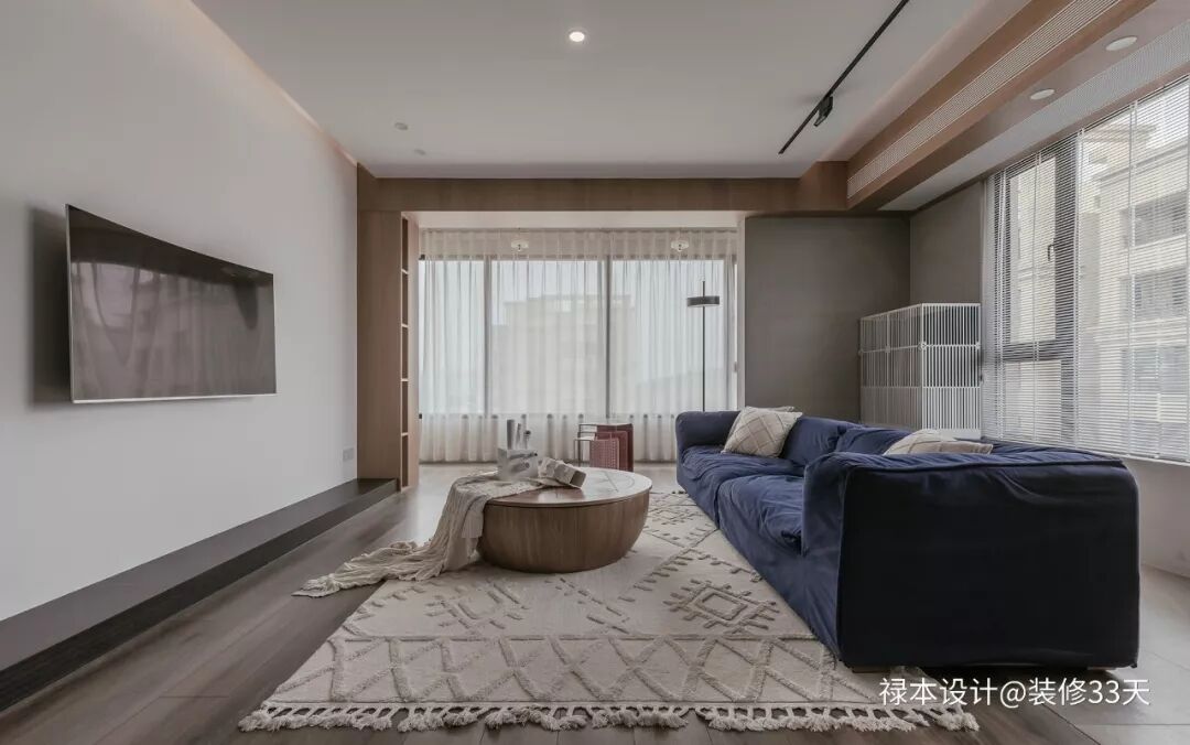 ▲ 客厅,双面采光加留白墙顶面,壁挂电视采用深色木纹地台取代传统电视柜