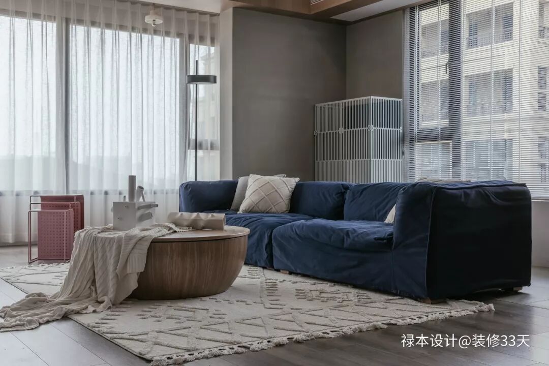 ▲ 蓝色布艺沙发搭配温润的原木茶几,抱枕与地毯材质色调相互呼应