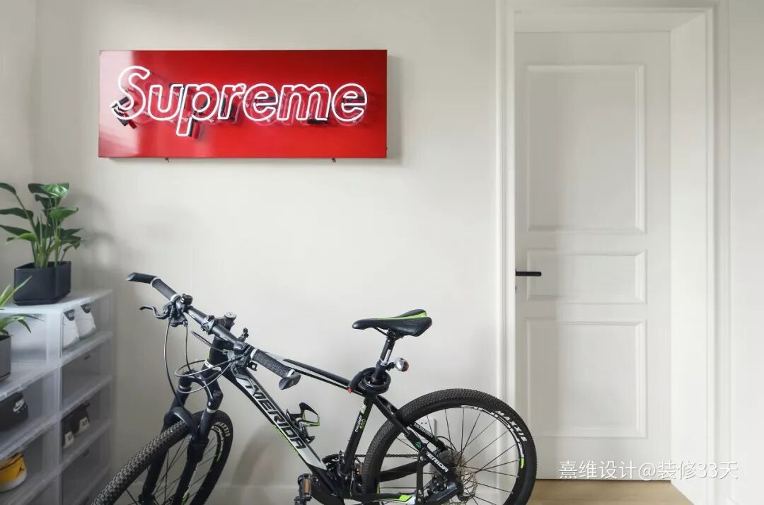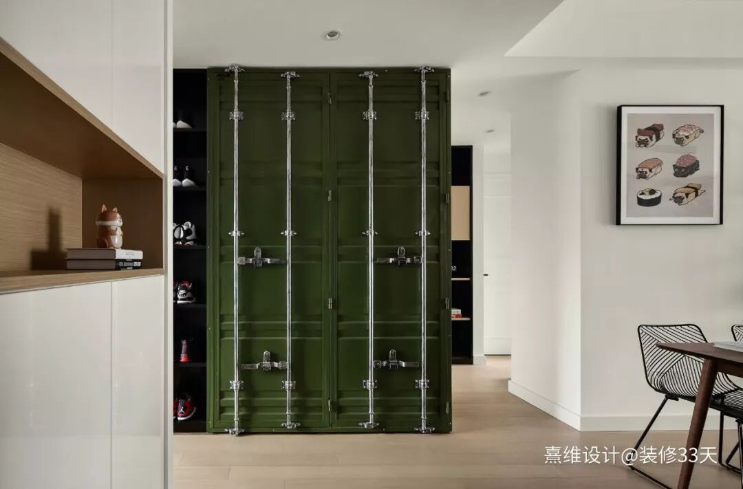 ▲ 入户,左侧设计中部留空的常规鞋柜,改变正对面原厨房的开门方向,利用S墙打造复古色调柜体,集装箱式大柜门,个性与格调十足,展示、收纳AJ球鞋