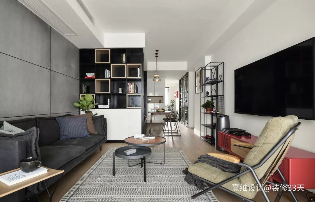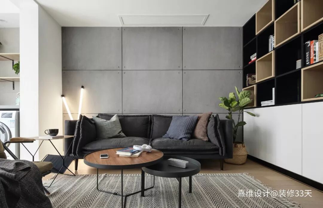 ▲ 原木色地板+水泥板沙发背景墙,搭配高级灰色调的布艺沙发,整体元素搭配又不失违和感,舒适而自由