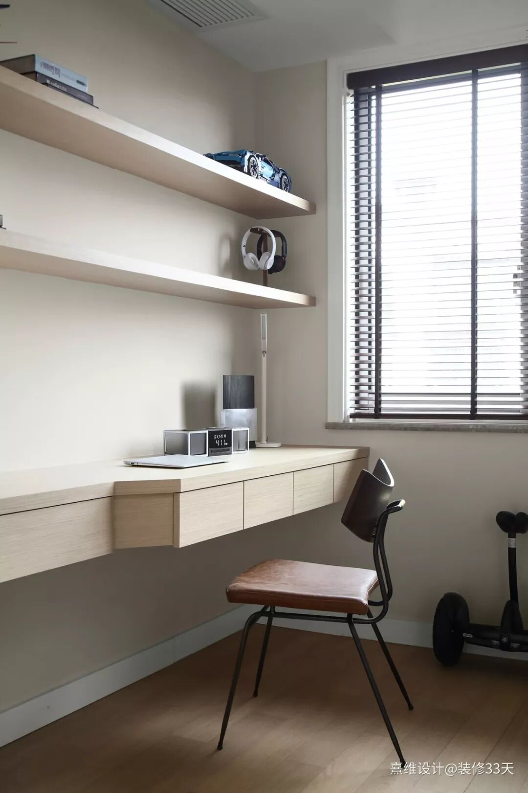 ▲ 多功能房,木地板结合木质台面与置物层板,搭配暖调的墙面色彩,在材质上追求舒适,在格调上追求时尚