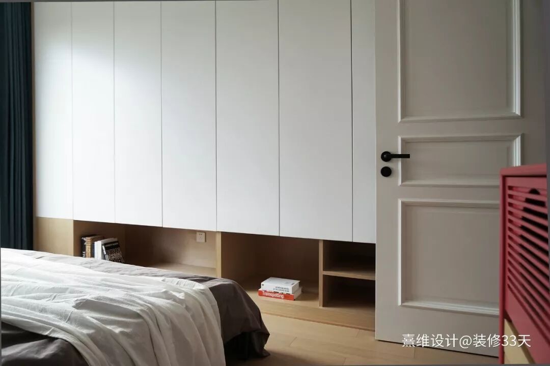 ▲ 床尾整面的定制储物柜底部作开放式处理,床侧红色柜体与电视柜呼应,为空间注入跳跃色彩