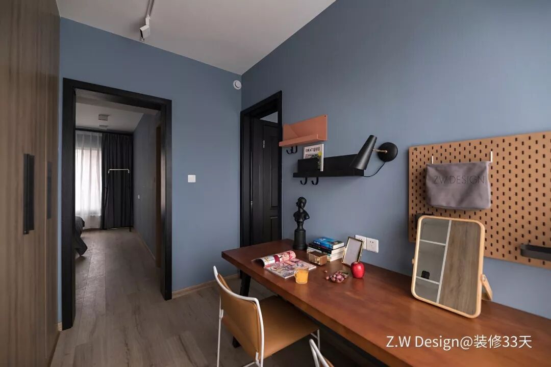 ▲ 书房,蓝灰色墙面搭配木色地面与柜门,加长书桌安排双位设计,提高使用率,利用墙面收纳装饰背景墙,后方的大衣柜让书房兼具衣帽间的机能
