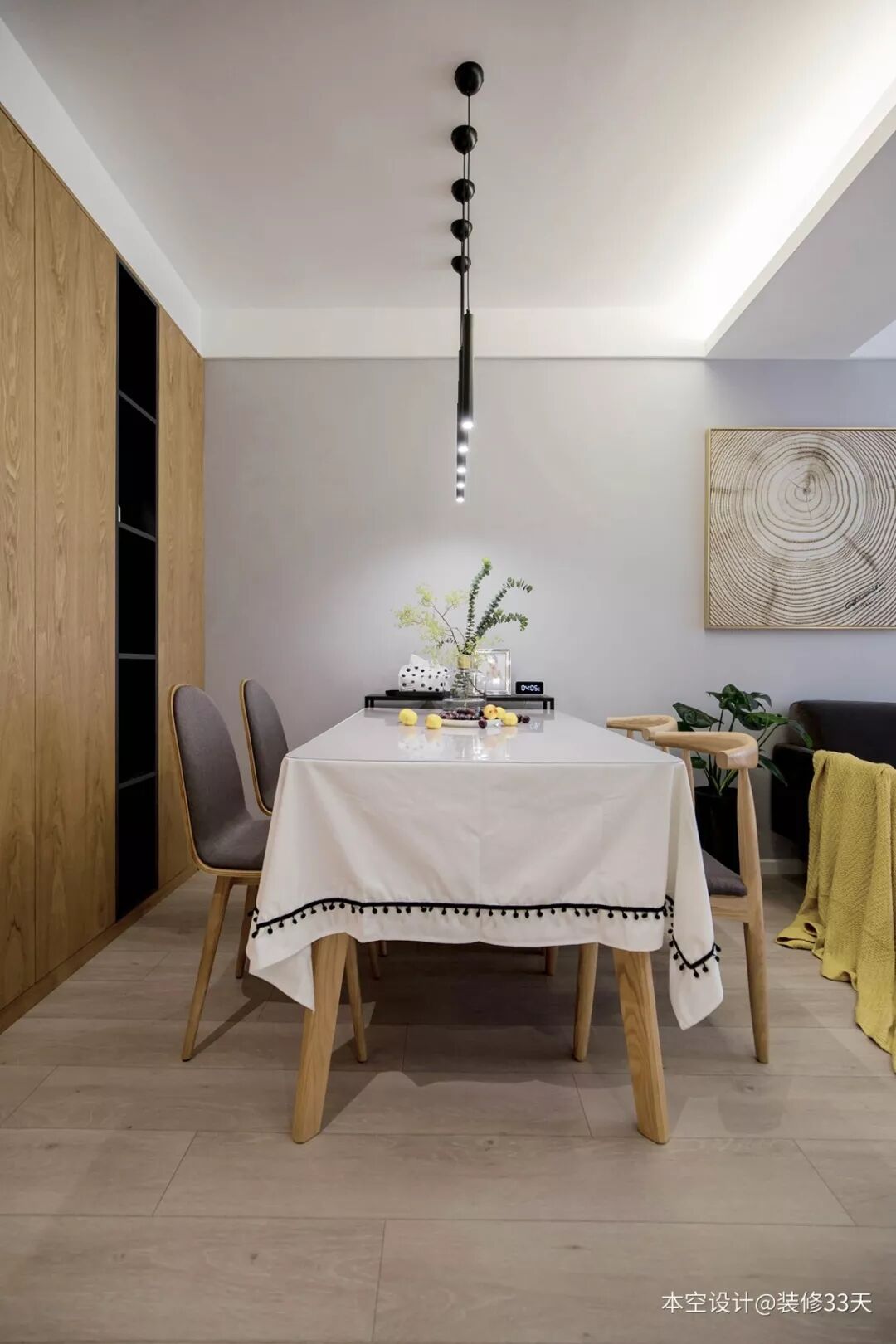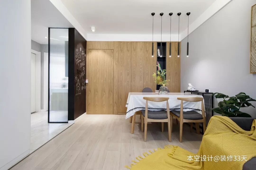 ▲ 餐厅延续客厅风格,木纹地板搭配灰色背景墙,选用圆润的餐桌椅防止磕碰