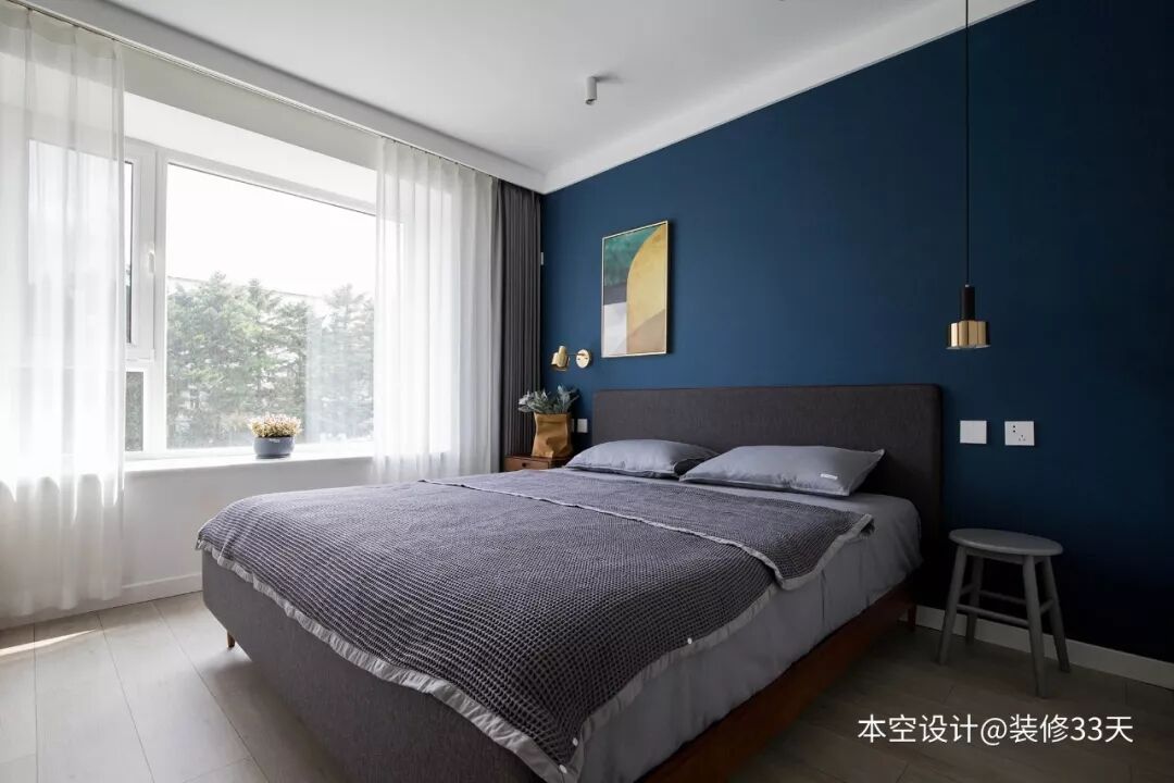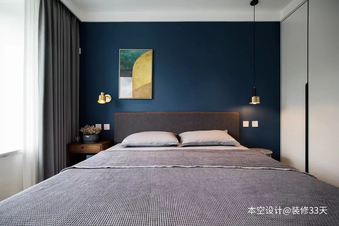 ▲ 主卧,黑色高背床搭配深蓝色背景墙,营造出静谧的舒眠氛围
