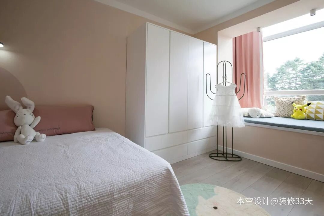▲ 女儿房配色温馨可爱,公主床靠墙放置,留出宽敞的活动空间,设计软木墙作为孩子绘画作品展示区