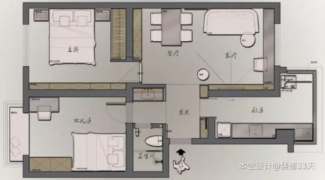 ▲ 餐桌背后打造储物空间,解决餐边收纳,并在左侧设计出隐形门片为主卧入口