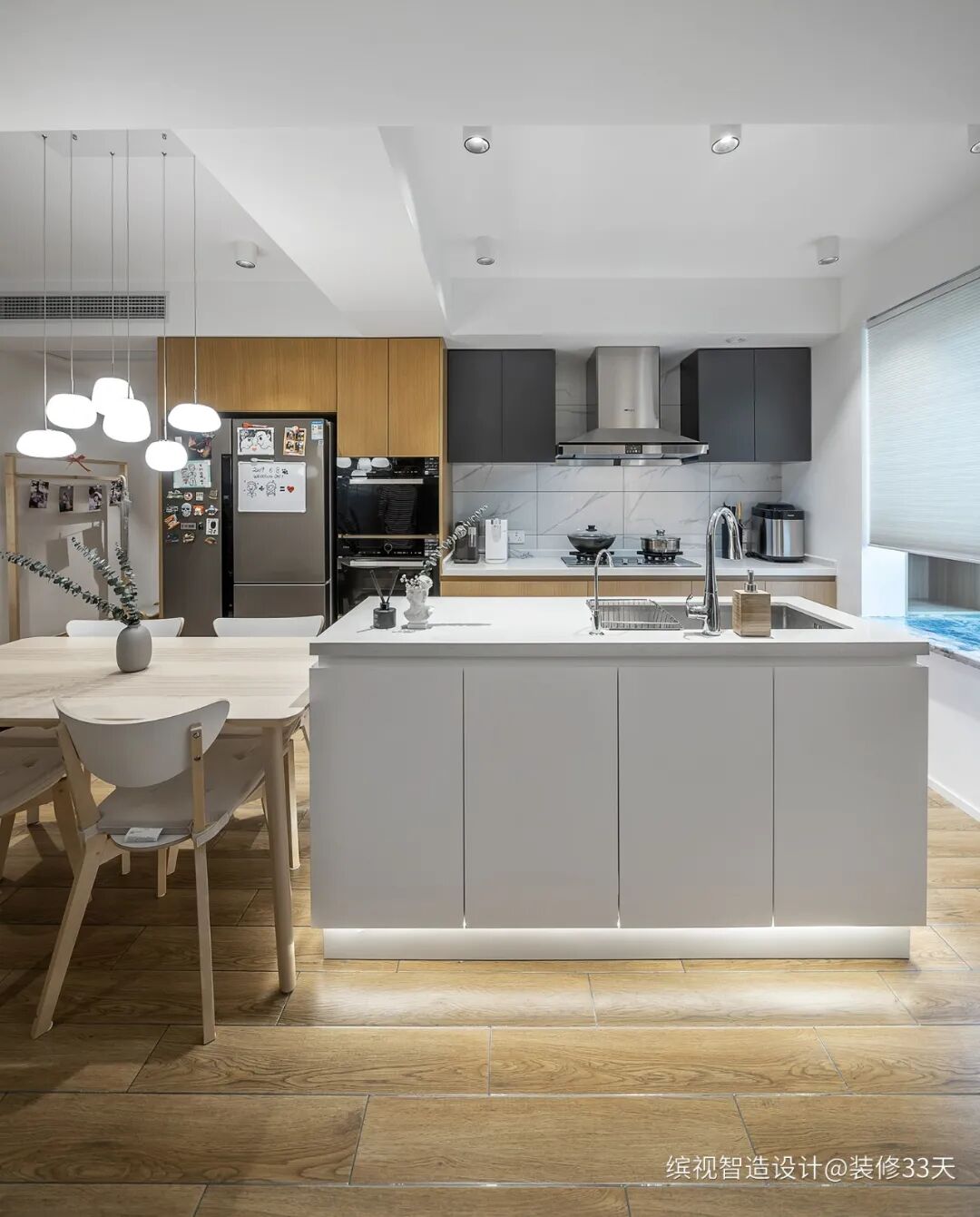 ▲ 开放式餐厨区,将中岛台和餐桌相连,增加使用机能,相互延展使用空间