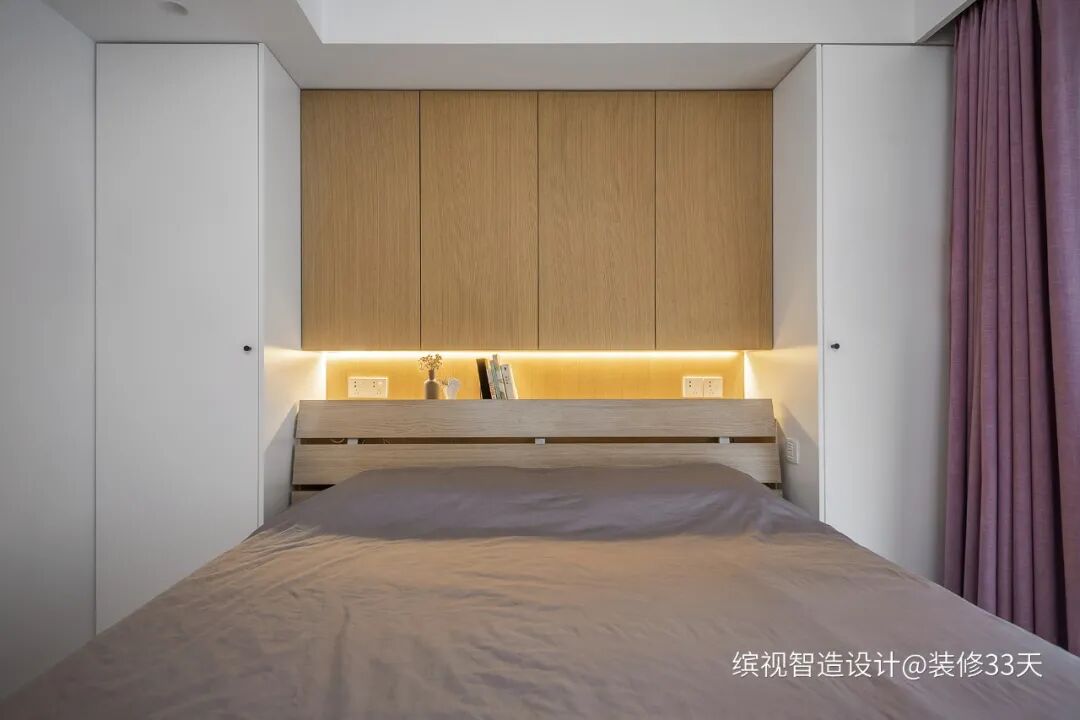 ▲ 主卧,床头两侧与上方空间打造储物柜,吊柜下方留空,具备床头柜的功能,并预留了插座与灯带