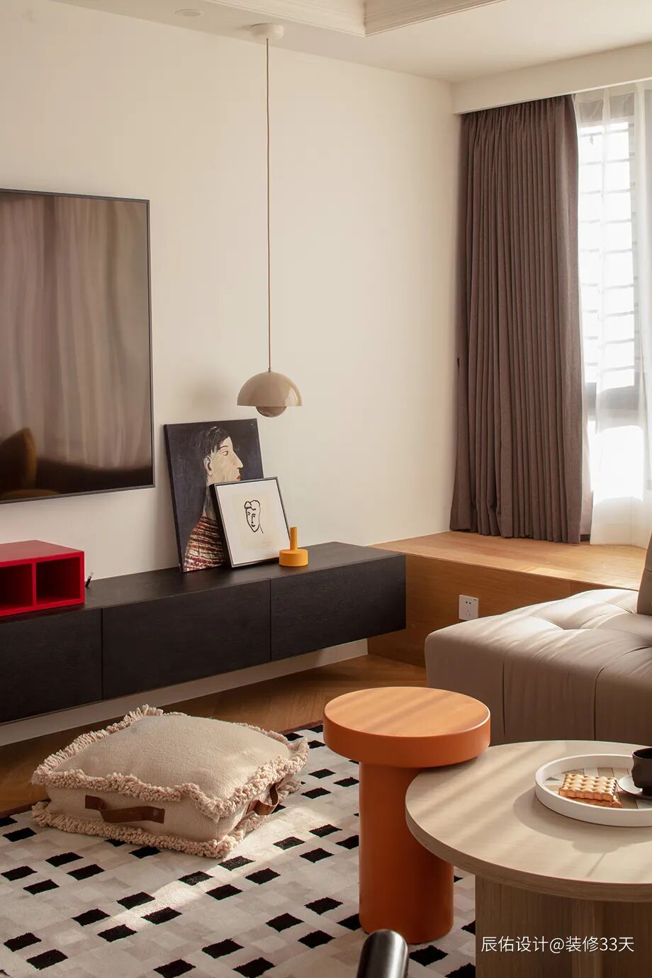 ▲ 将电视柜与飘窗设置同一高度,形成视觉上的贯穿组合,加强纵深感与延展性,在空间中形成结构呼应互动