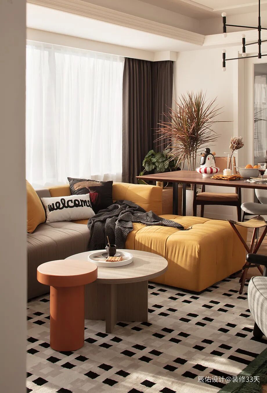 ▲ 拼色沙发搭配橙色造型茶几,结合黑白相间的地毯,营造出舒适、慵懒、浪漫的氛围