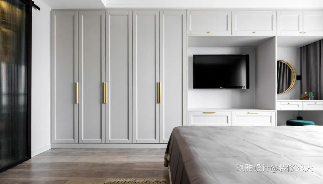 ▲ 定制整墙柜体兼具背景墙的功能,将储衣区(左边),电视柜(中间),梳妆台(右边)合三为一