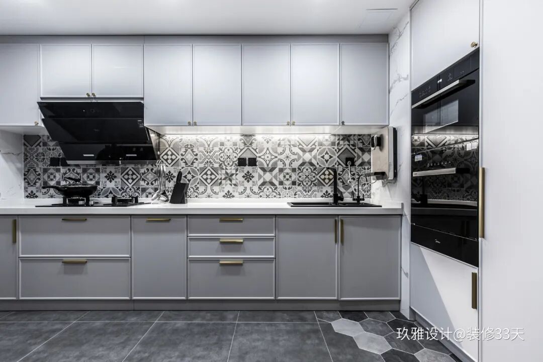 ▲ 厨房整体配色为灰色,地柜和吊柜之间采用花砖加灯光打造抢眼背景,统一的灰色中有造型的变化