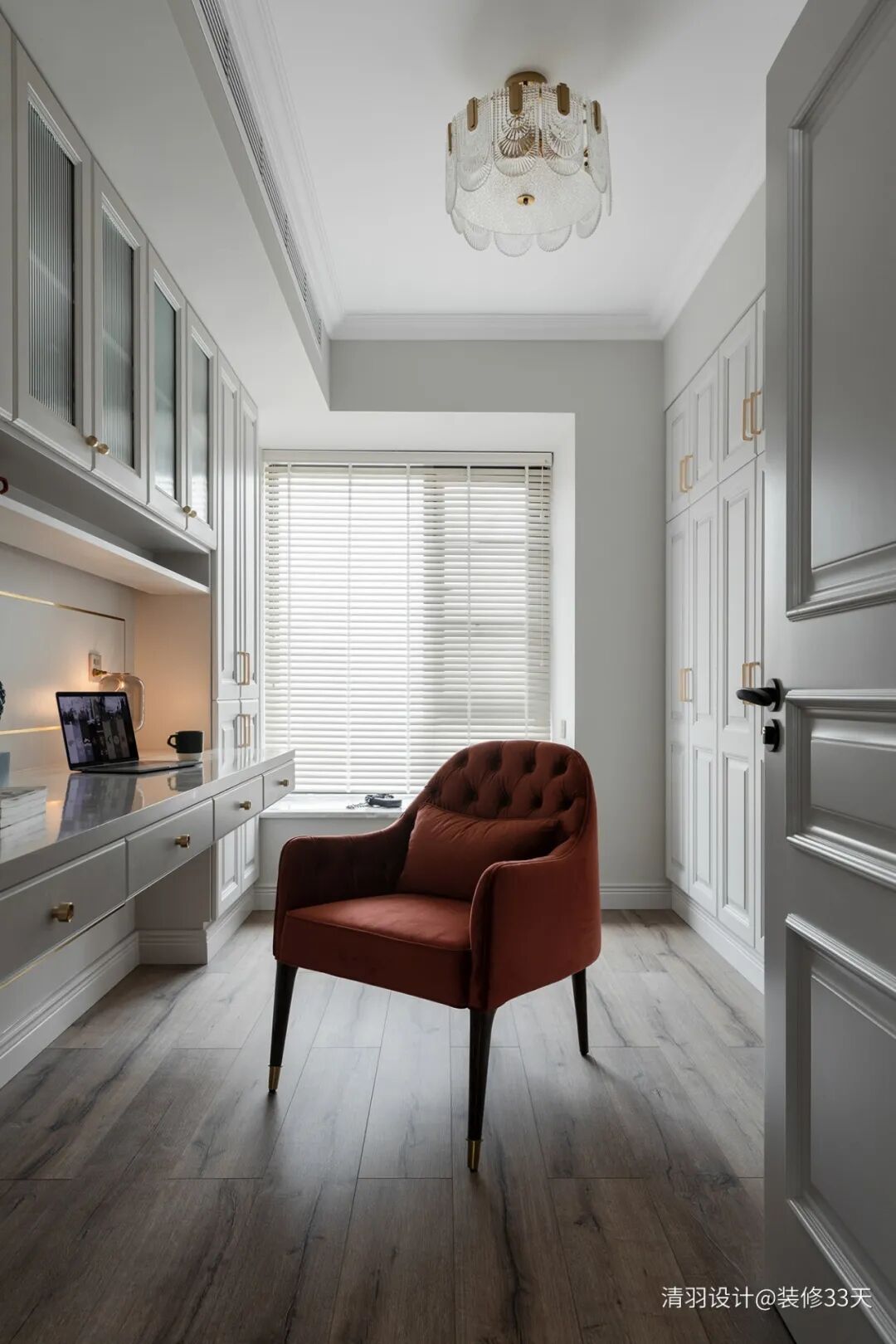 ▲ 主卧室相呼应的护墙板加金属元素贯穿书房,强大的收纳功能无处不在