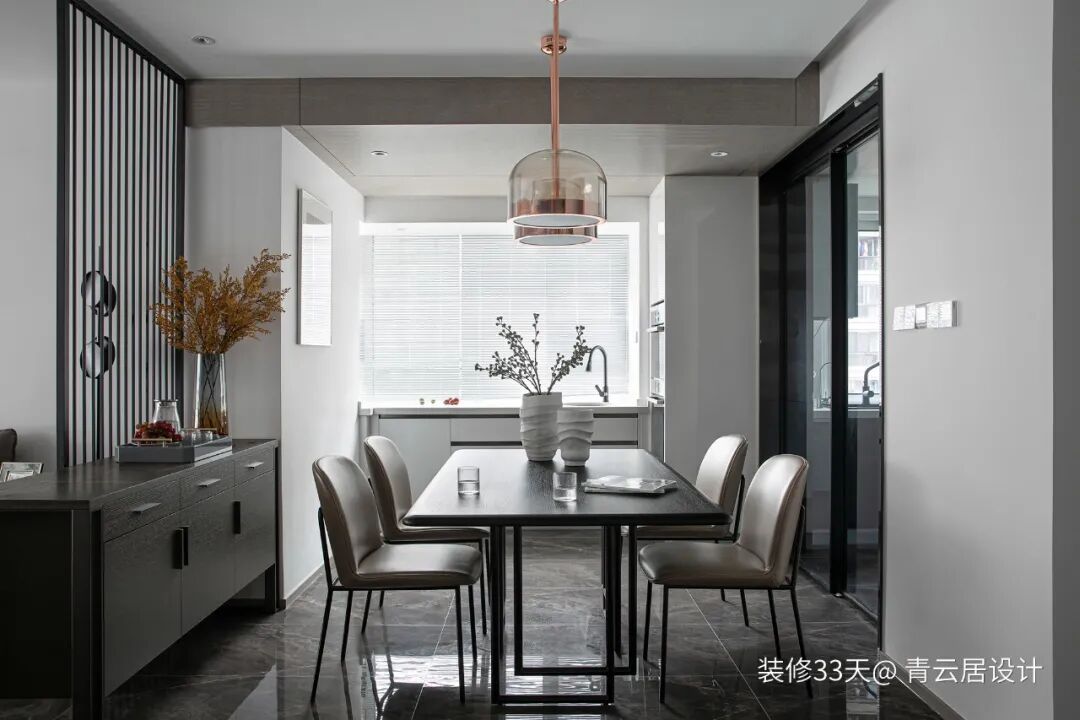 ▲ 现代风格的餐桌椅搭配玫瑰金玻璃吊灯,中性中带着浪漫与精致