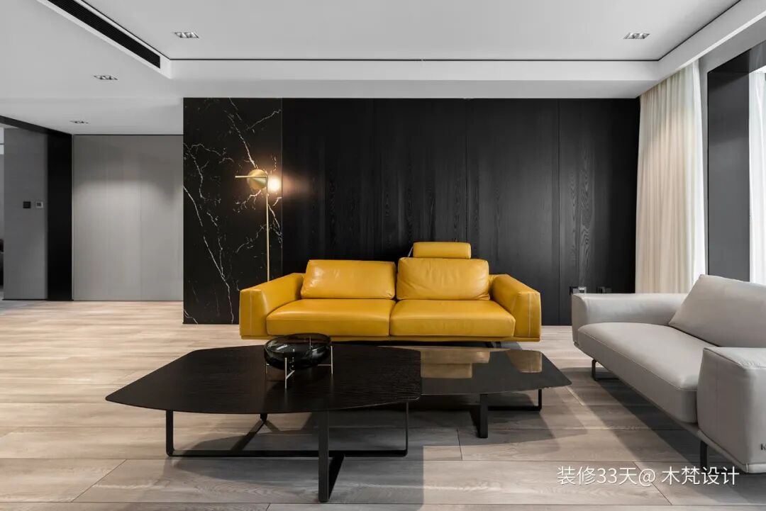 ▲ 客厅,鹅黄色的真皮沙发与金色落地灯,突破黑色基调带来的压抑和沉寂的氛围,背景墙选用墨色石材和黑色木纹相拼接,从材质上增添层次感