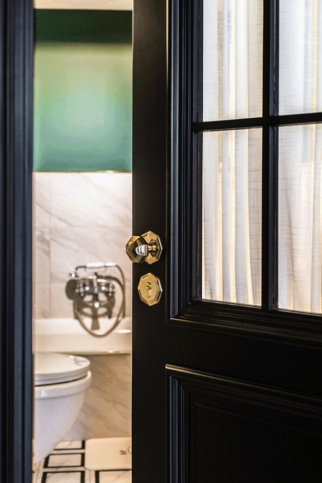 ▲ 主卫入口的定制多边形把手搭配方格玻璃门框,醒目的黑白相间的瓷砖极具现代魅力风格,绿色墙漆与卫浴用品充满复古韵味