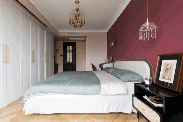 ▲ 主卧,一大片玛瑙红墙漆做床背景,搭配淡淡的尤加利绿色床品和窗帘,床尾打造整面制定收纳,采用电动幕布取代传统电视墙
