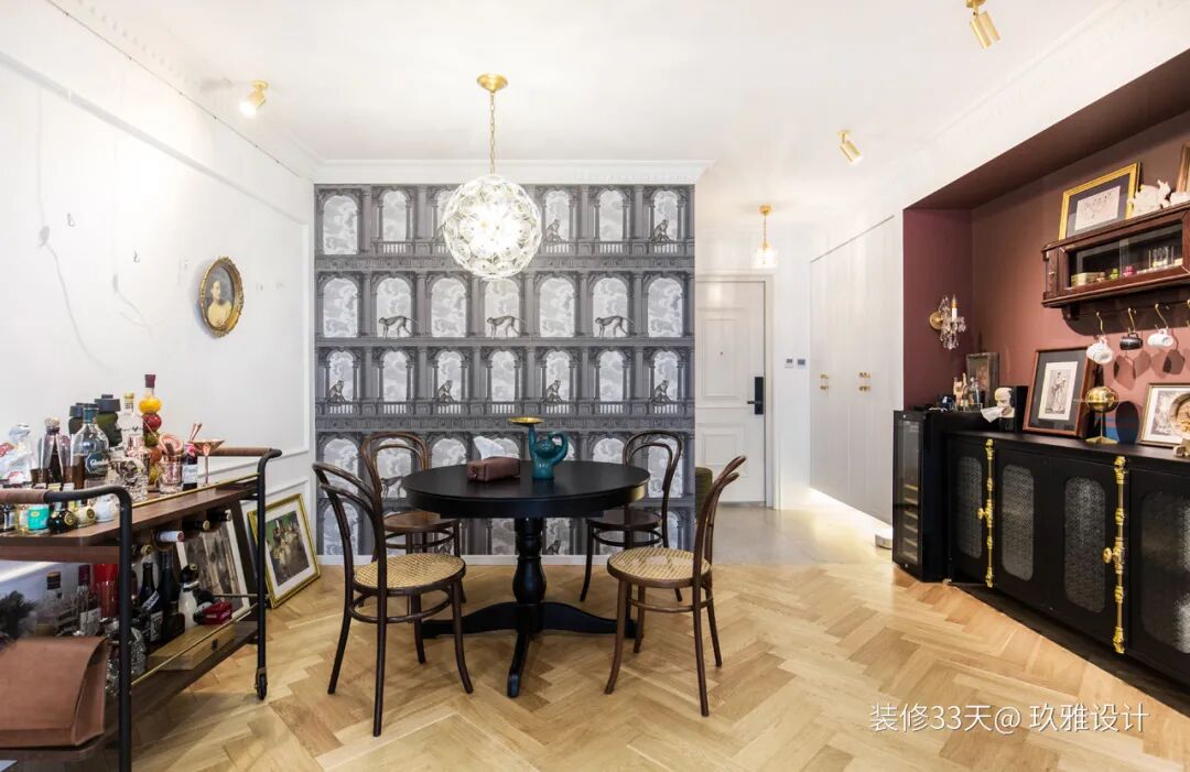 ▲ 压缩原储藏间,拓展餐厅面积,通过地面铺贴不同的材质过度门厅与餐厅,英国 Cole and Son 品牌的壁纸做背景,搭配中古风的家具与软装,金色元素提升整体精致度